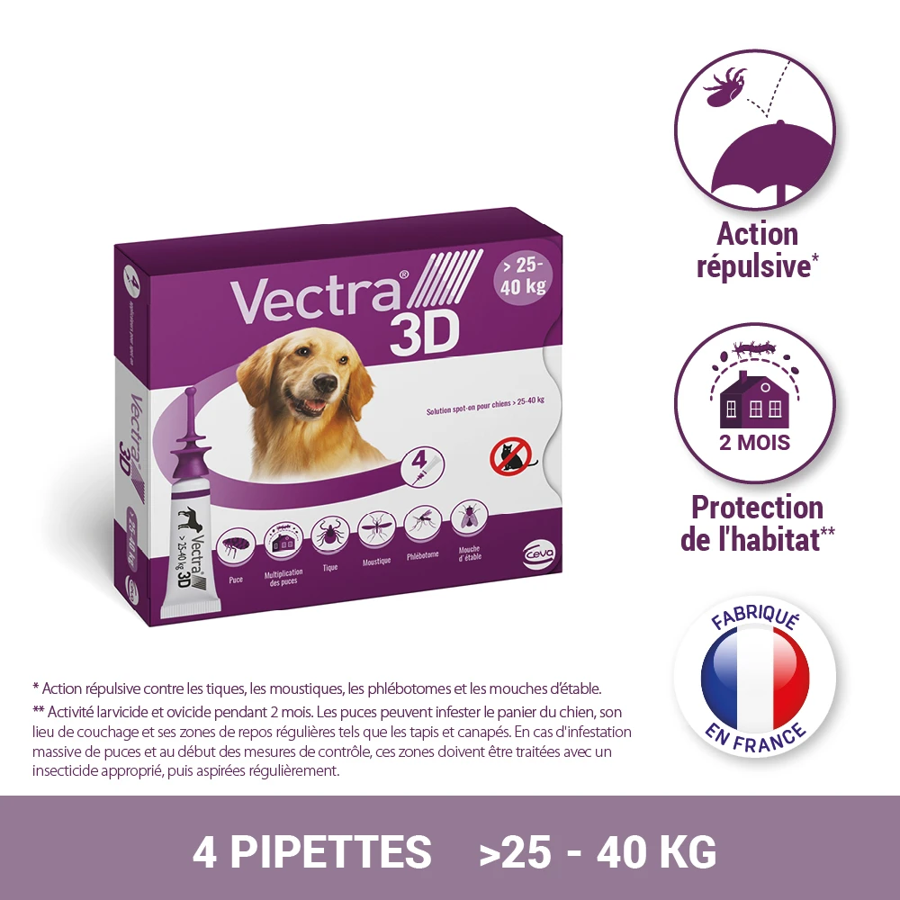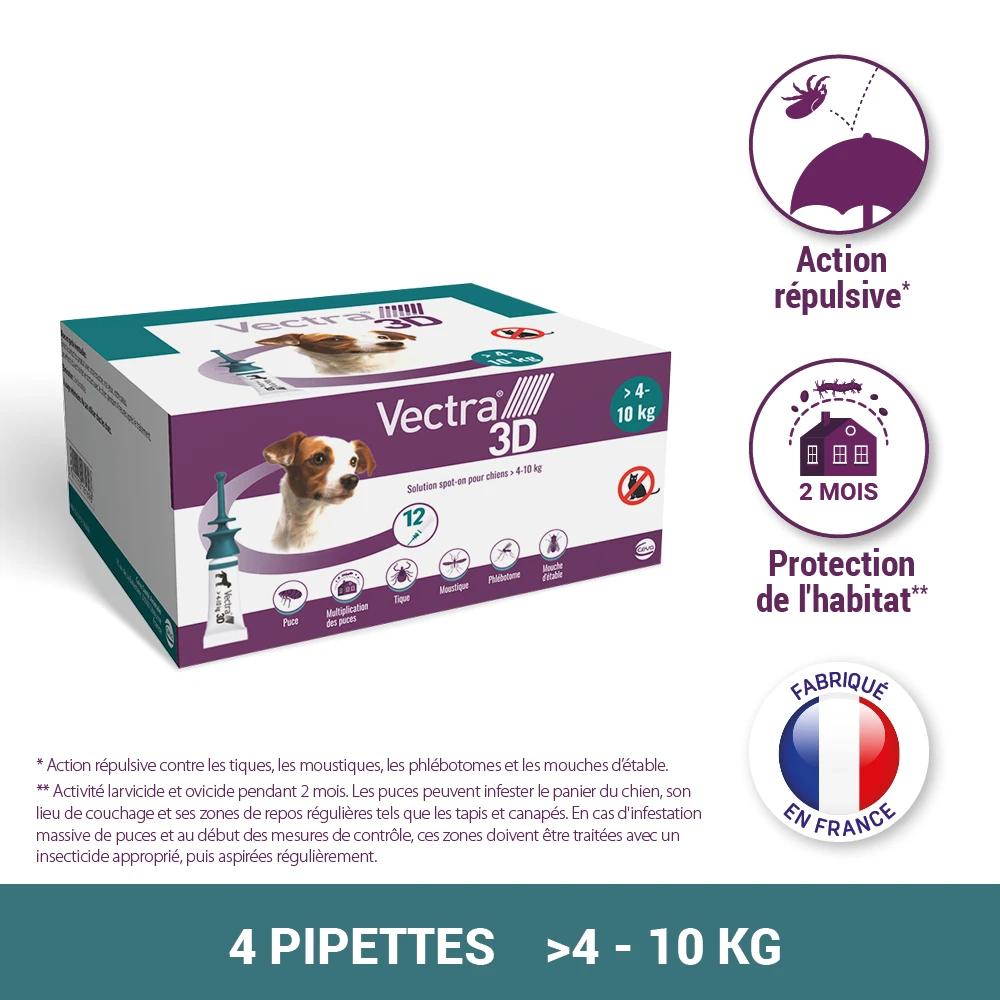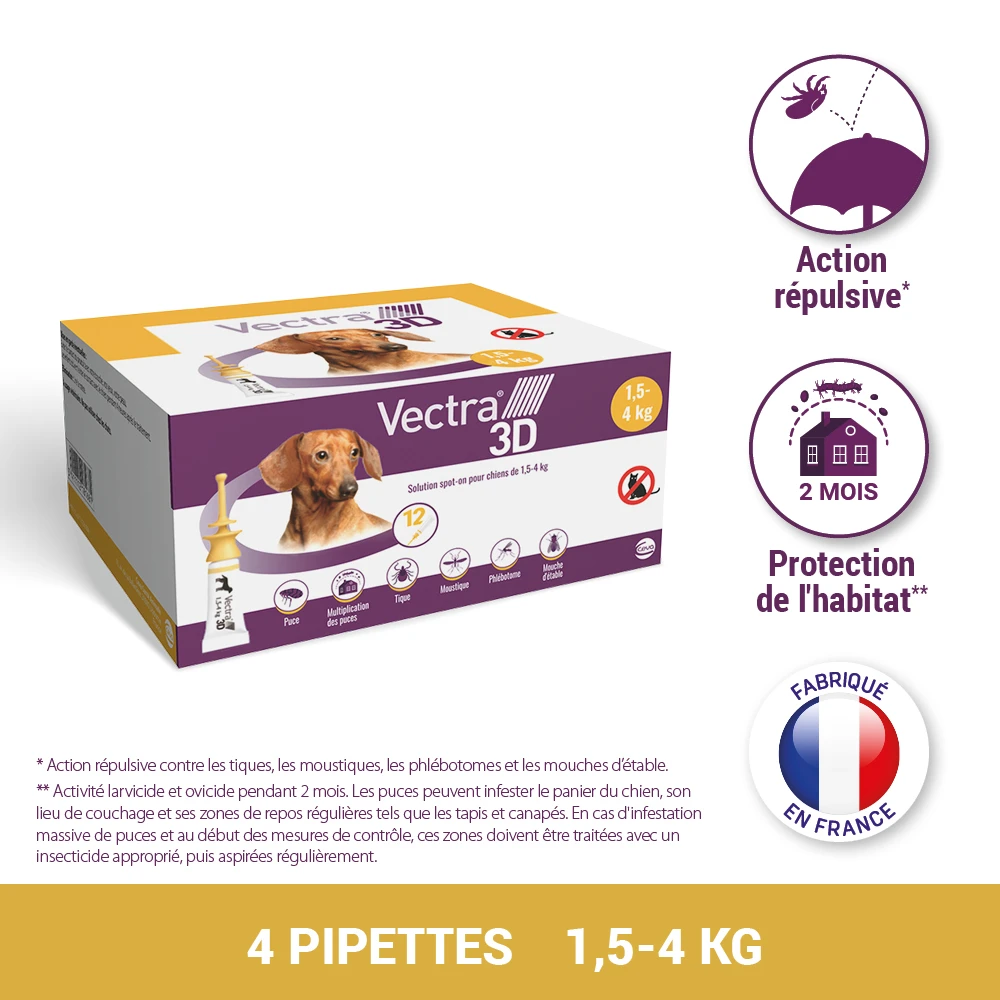 – Tiques : le médicament vétérinaire a une efficacité acaricide et répulsive persistante contre les tiques (Rhipicephalus sanguineus et Ixodes ricinus pendant un mois, et Dermacentor reticulatus pendant trois semaines maximum).