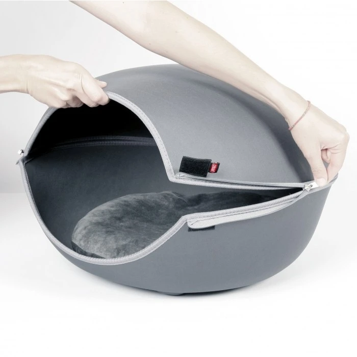 En version hiver, lorsque votre animal a besoin de chaleur, la partie supérieure se fixe à la base du couchage à l’aide d’une simple fermeture éclair. Vous pouvez y ajouter une couverture en plus du coussin amovible conçu dans une fourrure synthétique toute douce. En été, retirez la partie supérieure du dôme pour que votre chien ou votre chat respire à son aise. Le couchage se transforme alors en corbeille dotée d’un très grand confort.