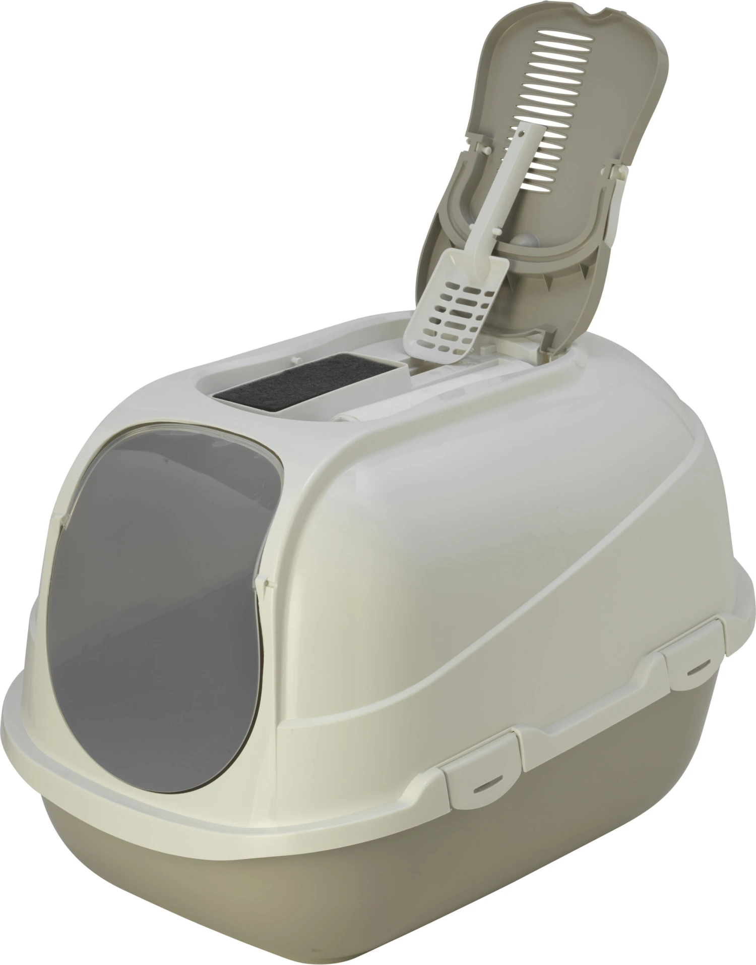 Le bac à litière Hera XL convient également aux chats de grande taille. Il est munie d’une poignée qui vous permet de le déplacer facilement. Sur le dessus se trouve un filtre à charbon remplaçable qui combat les mauvaises odeurs. Le couvercle s’enlève facilement grâce à un système de clics, ce qui vous permet de nettoyer le bac à litière. Il est livré avec une pelle à chat.
