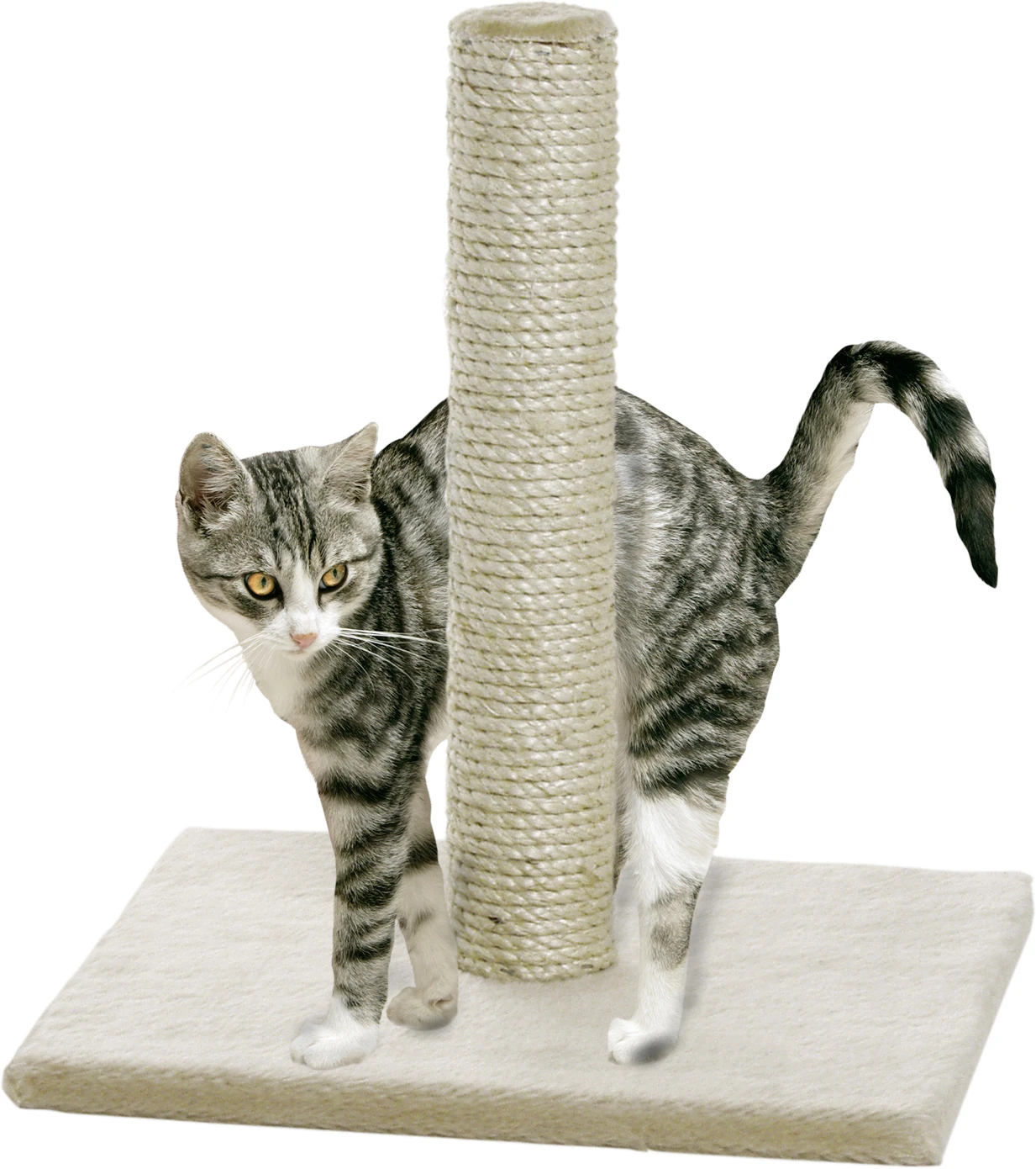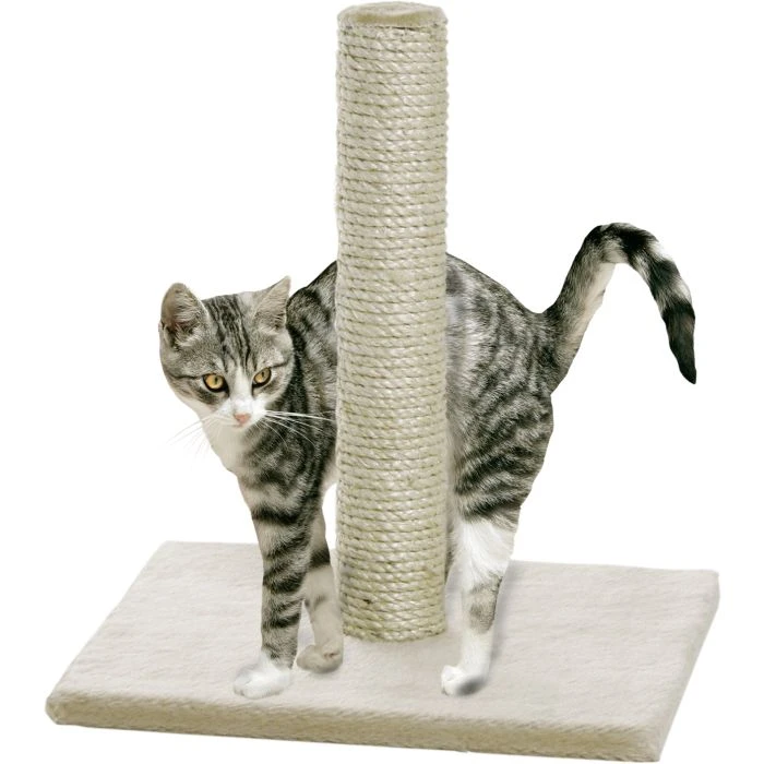 Petit griffoir avec base en peluche et poteau en sisal pour que votre chat puisse s’Ă©tirer et faire ses griffes.