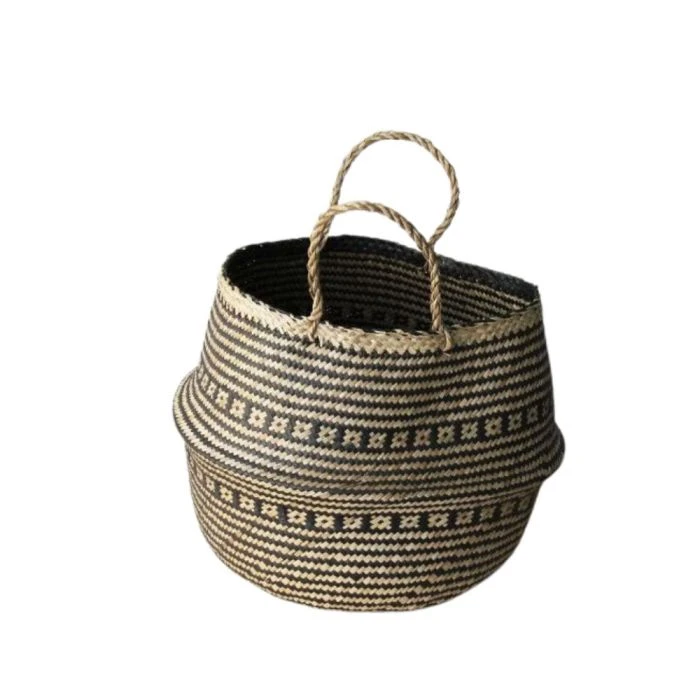 Révélez votre décoration avec ce panier en jonc de mer naturel aux motifs mosaïques noirs tressé artisanalement.