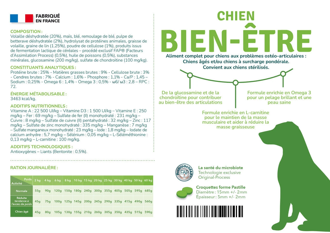 Volaille déshydratée (20%), maïs, blé, remoulage de blé, pulpe de betterave déshydratée (2%), hydrolysat de protéines animales, graisse de volaille, graine de lin (1,25%), poudre de cellulose (1%), produits issus de fermentation lactique de céréales – procédé exclusif FAP® (Facteurs d’Assimilation Process) (0,5%), huile de poissons (0,5%), substances minérales, glucosamine (200 mg/kg), sulfate de chondroïtine (100 mg/kg).