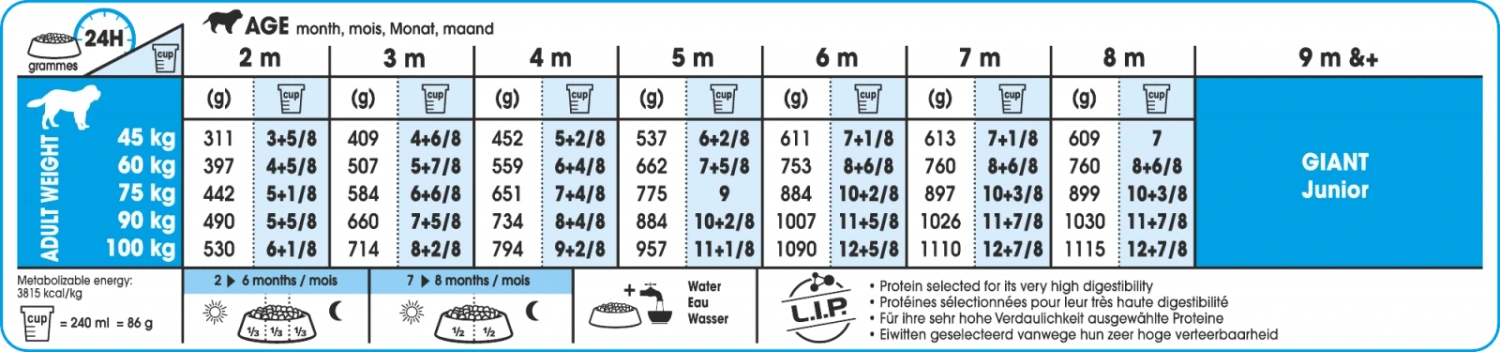Une alimentation pour chiots de très grande races (poids adulte à partir de 45kg) de 2 à 8 mois.