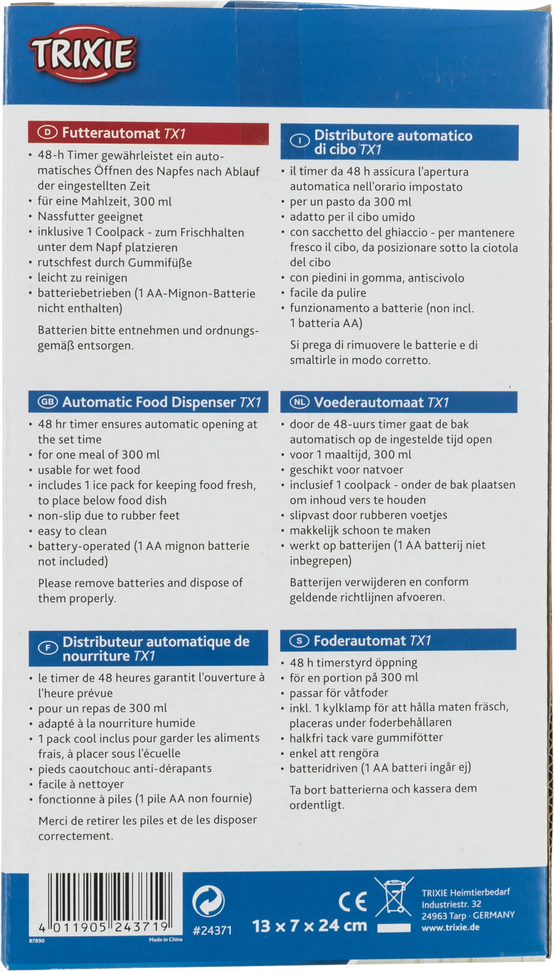 - Intervalle des repas (pour max. 48 h) réglable pour un repas de 0,3 l