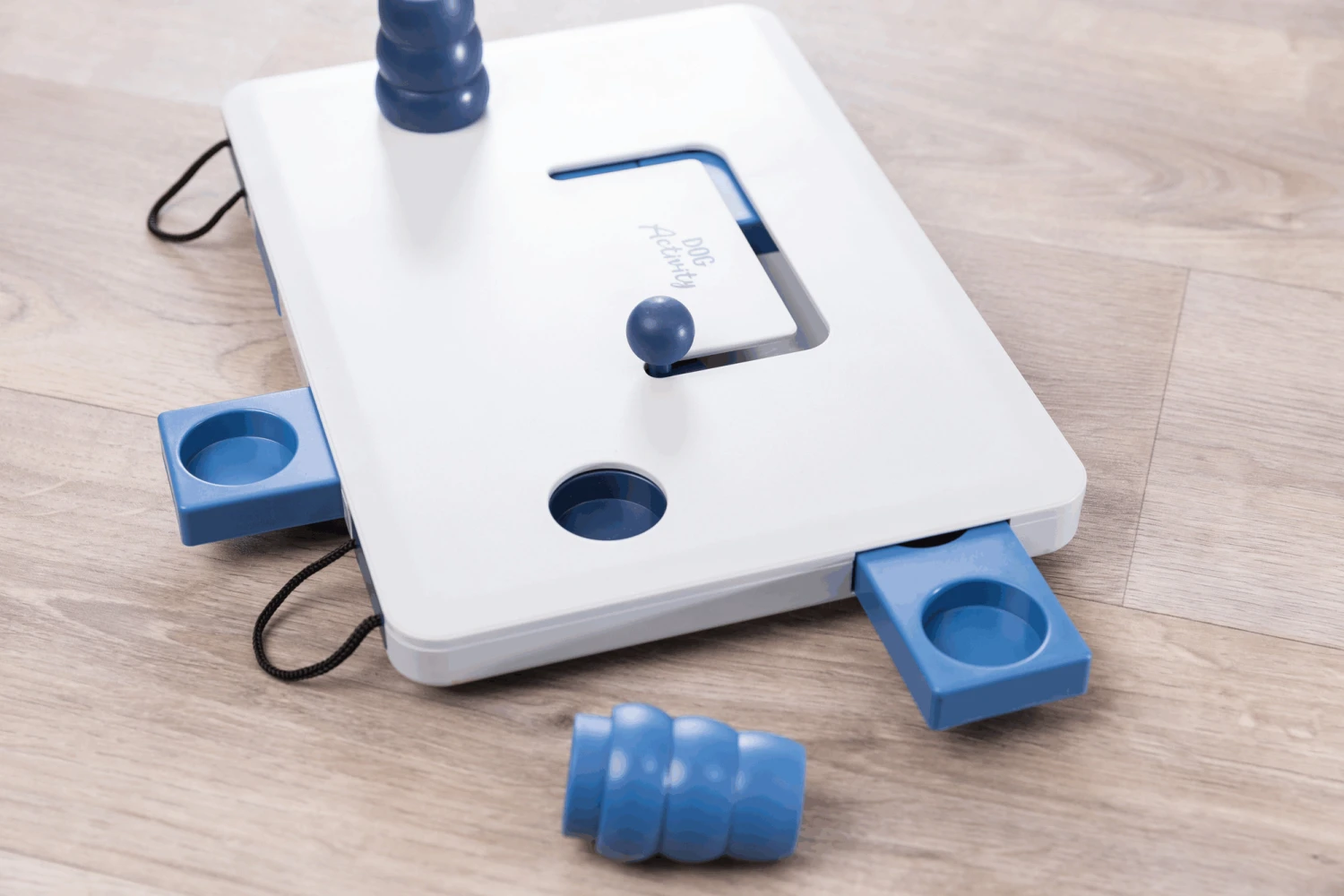 Cachez quelques friandises sous les cônes et dans les tiroirs. Votre chien doit tirer les cônes hors des trous, ouvrir les tiroirs en tirant les ficelles ou déplacer la poignée.